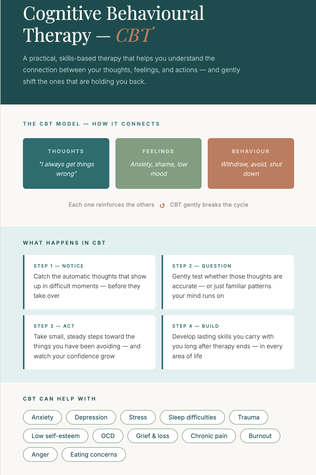 It works by helping you notice the connection between your thoughts, feelings, and behaviour, and then developing practical skills to shift that connection in a healthier direction.