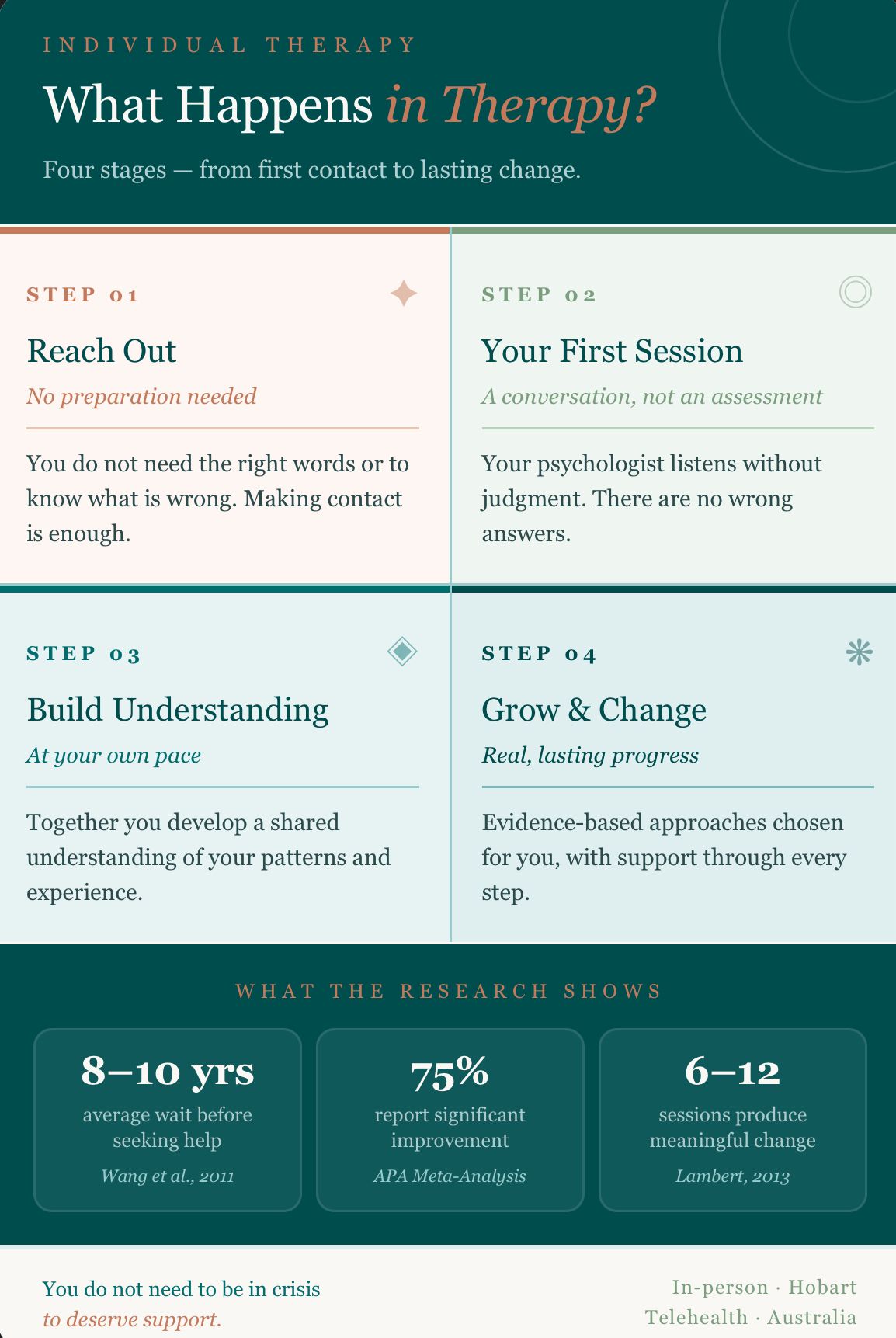 Your mental health journey is unique. That is why we take a trauma-informed, evidence-based approach. We support people of all ages across Hobart, Battery Point, Southern Tasmania, and Australia-wide to build confidence, resilience, and wellbeing.